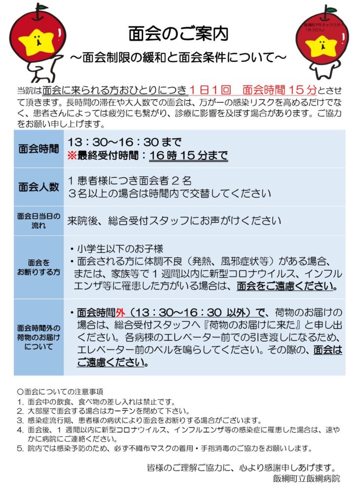 感染症対策として実施しておりました面会制限について、令和8年2月2日より以下の通り制限の緩和を行っております。